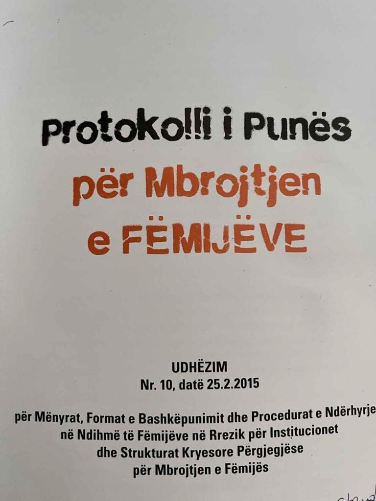 Protokolli i Punës për Mbrojtjen e Fëmijëve Ministritë përgjegjëse 2015 ( Ministria e Mirëqënies Sociale dhe e Rinisë; Ministria e Arsimit dhe Sportit; Ministria e Shëndetësisë; Ministria e Punëve të Brendshme;